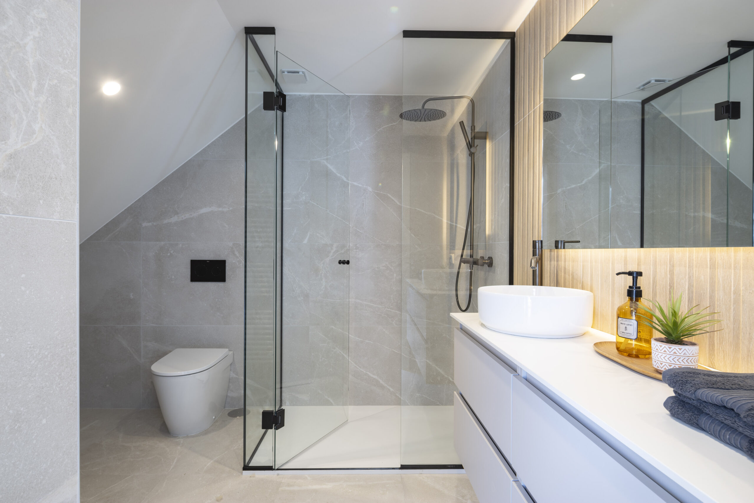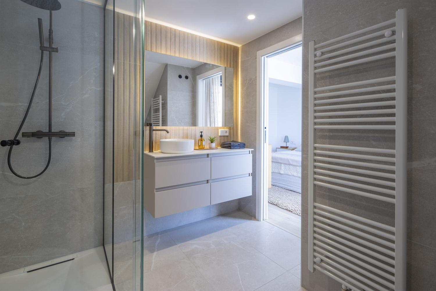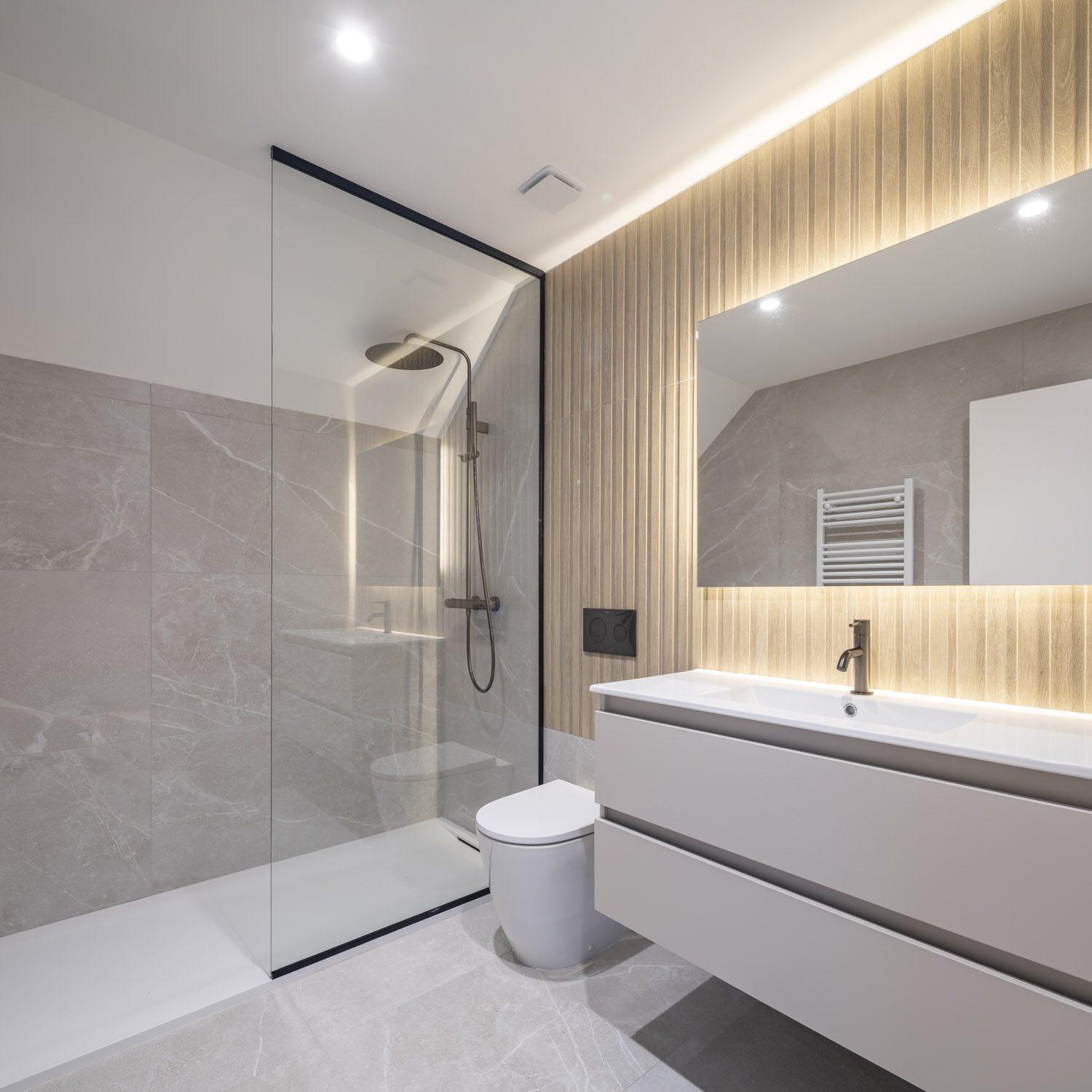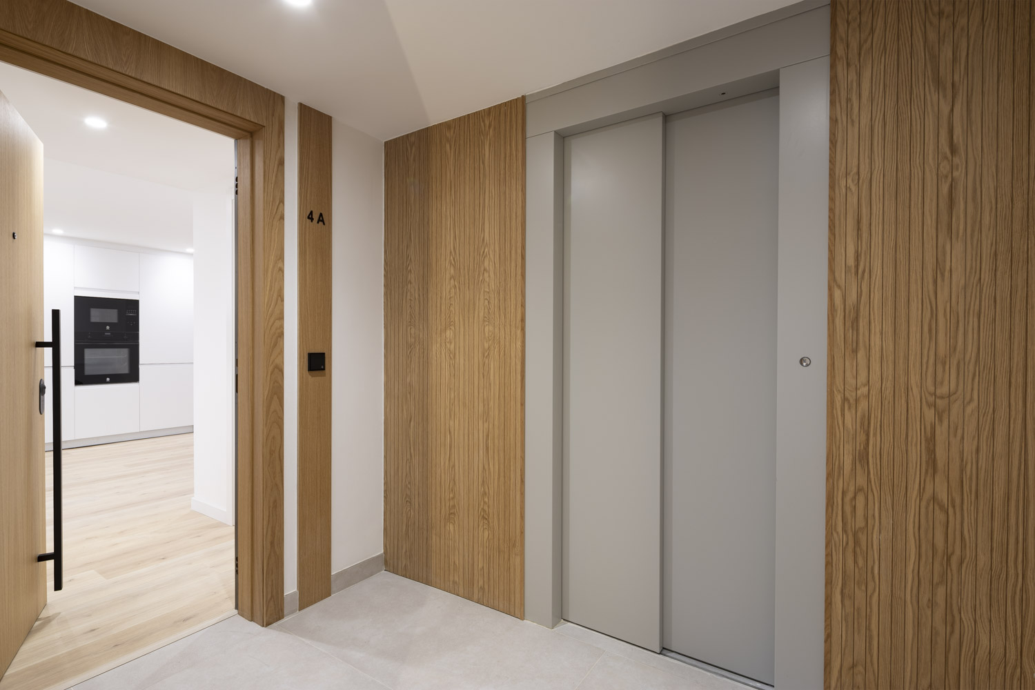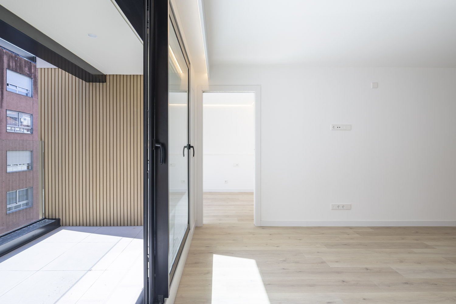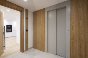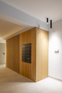 - Mejora de la envolvente con la implementación de una superficie transventilada en la fachada principal, a base de piezas de porcelánico ultracompacto Dekton, con sistemas de fijación oculto y paneles de madera tecnológica Tarimatec, diseñada específicamente para su uso en exteriores, sobre los cerramientos de ladrillo cara-vista originales.