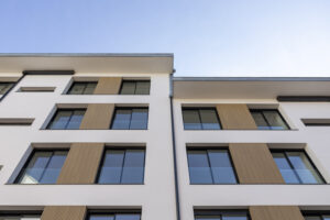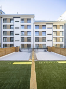 - Mejora de la envolvente en la fachada a patio de manzana, mediante sistema SATE con acabado en pintura pétrea, en el que se insertaron paneles de la misma madera tecnológica que en la fachada principal, conformando pequeños entrepaños que rompen la monotonía del acabado dominante.